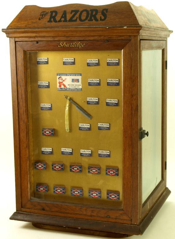 unique in its 3 sided 2" deep shadow box construction with rear glass door opening to large storage area. Original finish, samples and lettering remain, measures 36" X 22" X 2" on swivel base.
