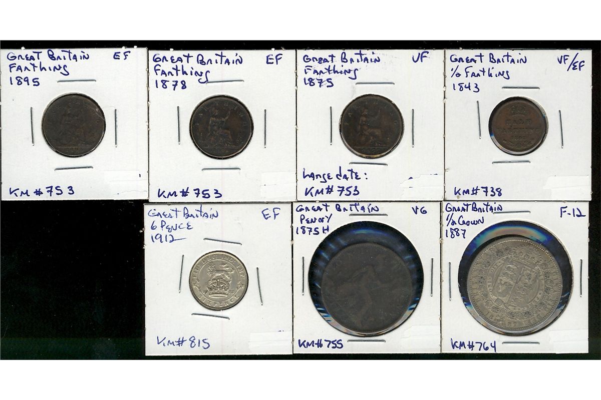 Great Britain; 1/2 Farthing 1843 VF/EF, Farthing 1875 VF Large Date, 1878 EF, 1895 EF, Penny 1875H VG, 6 Pence 1912 EF & 1/2 Crown 1887 F-12. Lot of 7 coins.