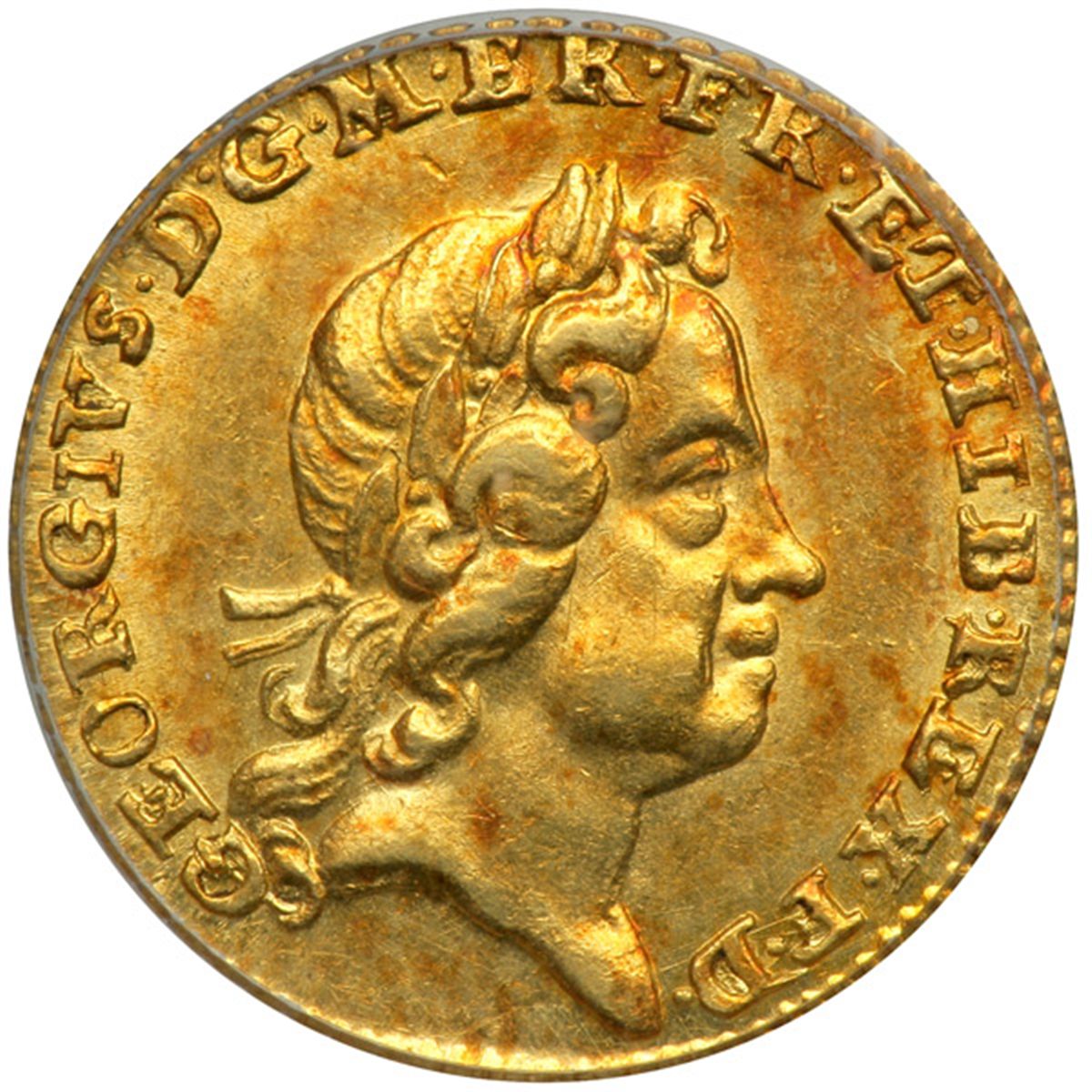 Great Britain. ¼ Guinea, 1718. S.3638; Fr-331; KM-555. George I. Laureate head right. Reverse: Crowned cruciform shields. One year type. PCGS graded MS-62.