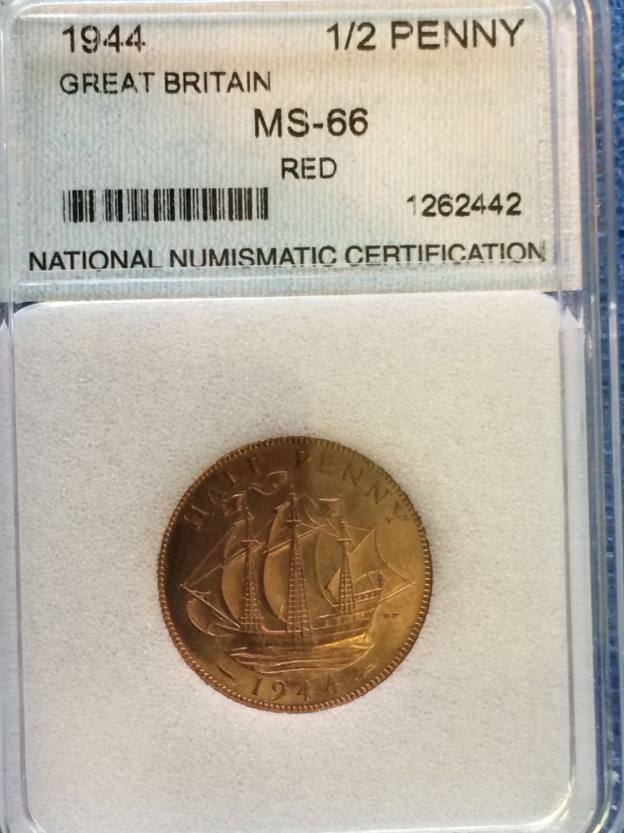 Great Britain 1 Farthing 1944; NNC certified MS-66 Red.