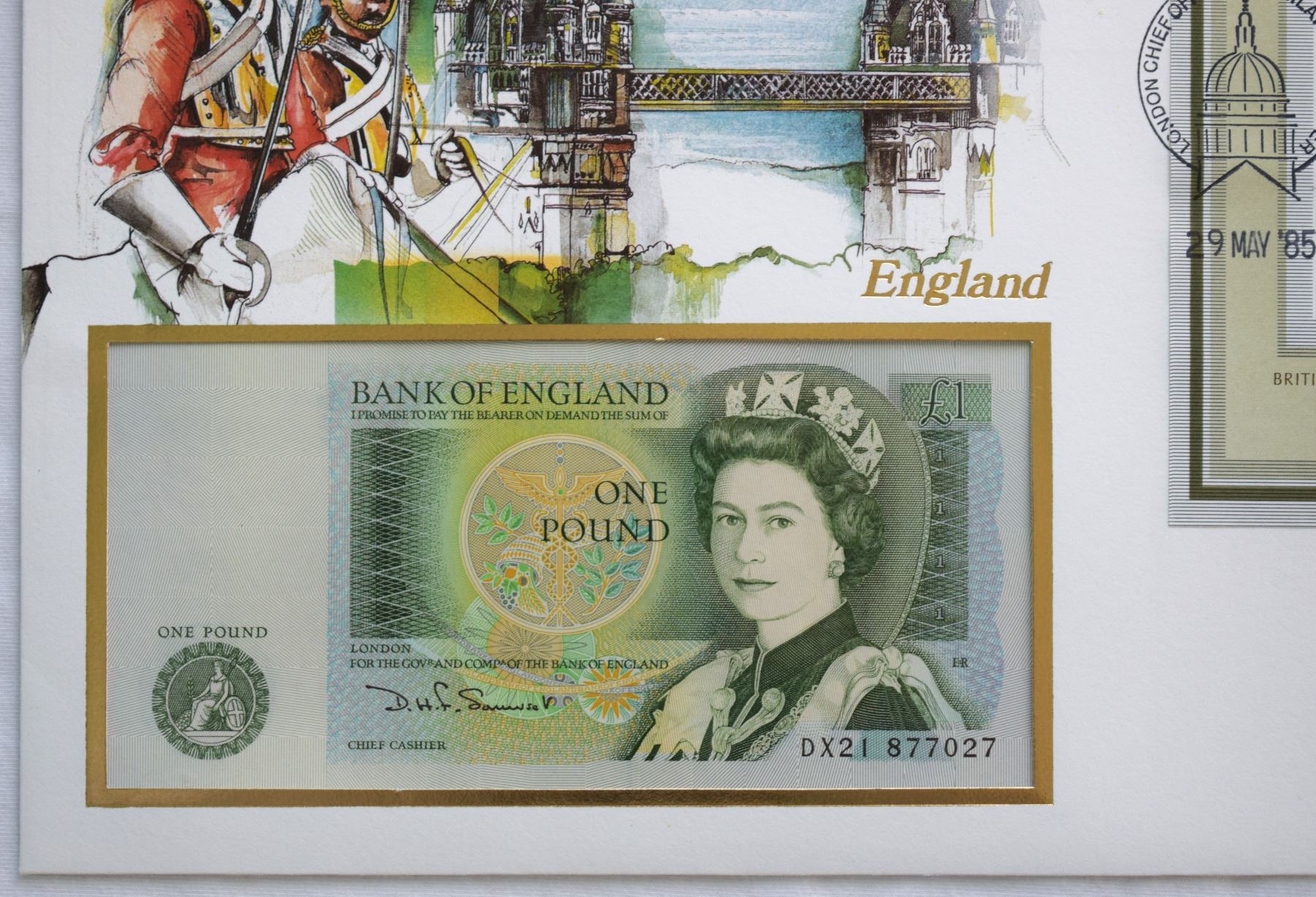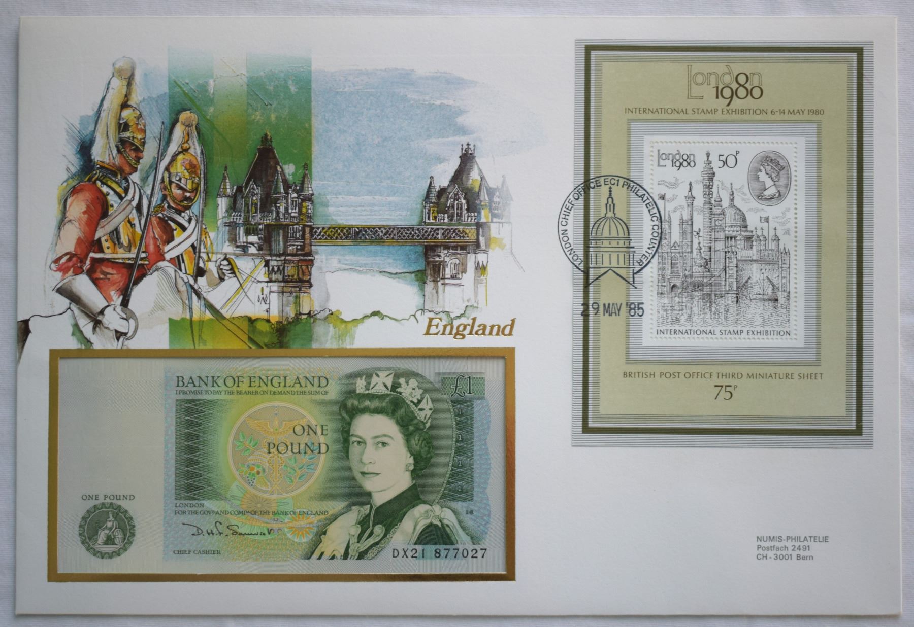 Great Britain, £1 ND (1981) First Day Cover Swiss Issued, QEII Pick# 377b Nice Vignette "London Bridge" and Philatelic Souvenir Sheet, Cancelled Philateic Council in 1985 Mint as Issued, Perfect.