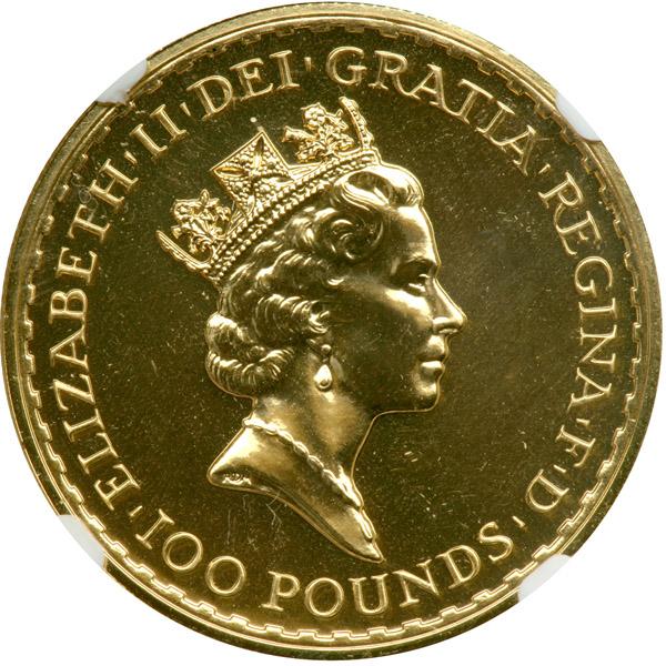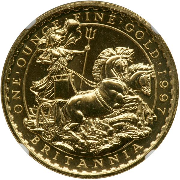 Great Britain. 100 Pounds, 1997. S.4283; KM-985. Weight 1 Ounce. Elizabeth II. Britannia in chariot. Issued on the 10th Anniversary of the Britannia series. NGC graded MS-69.