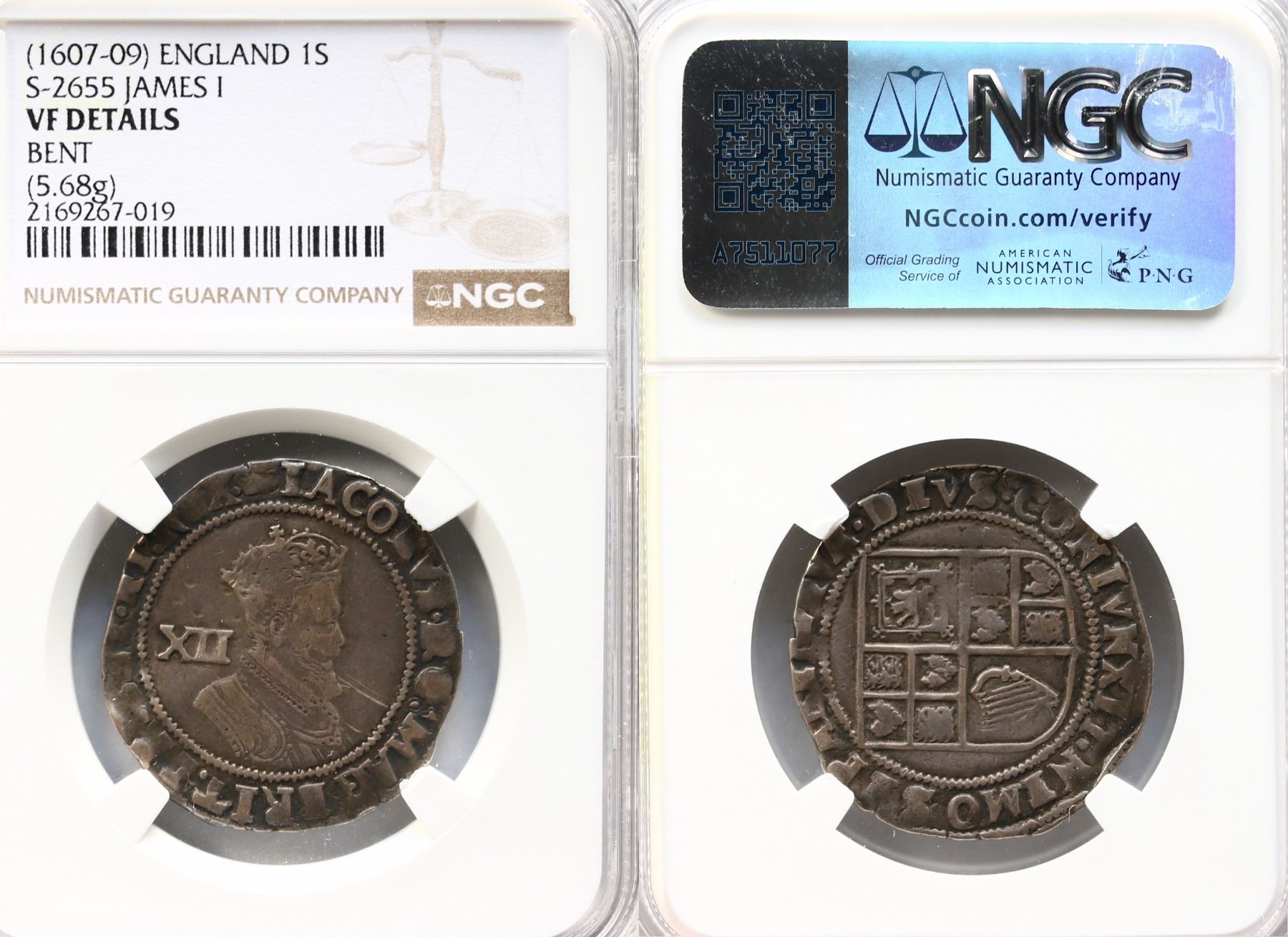 Great Britain; (1607-09) 1S - NGC VF Details bent. S-2655 - 5.68 Grams