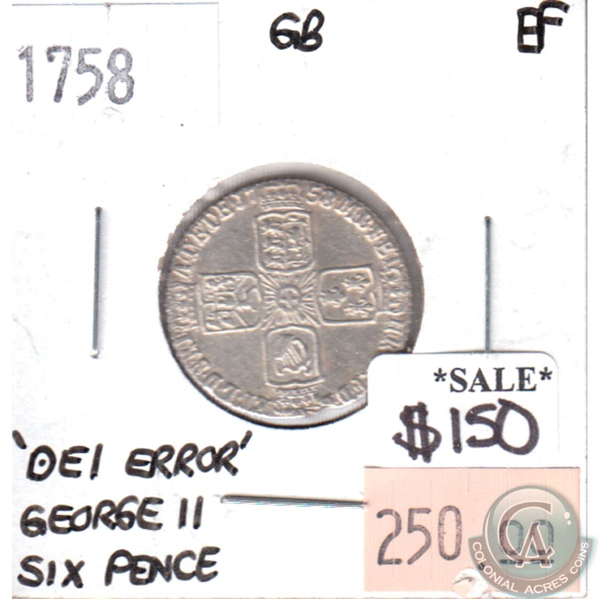 Great Britain 1758 'Dei Error' George II 6 Pence Extra Fine