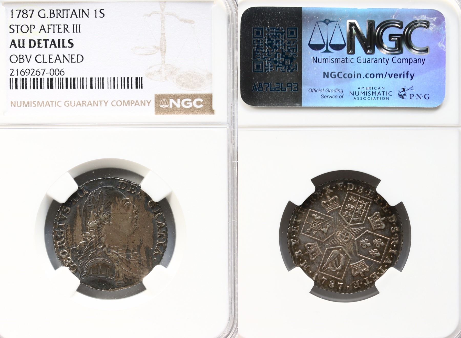 Great Britain; 1787 1S Stop after III NGC AU Details obv cleaned
