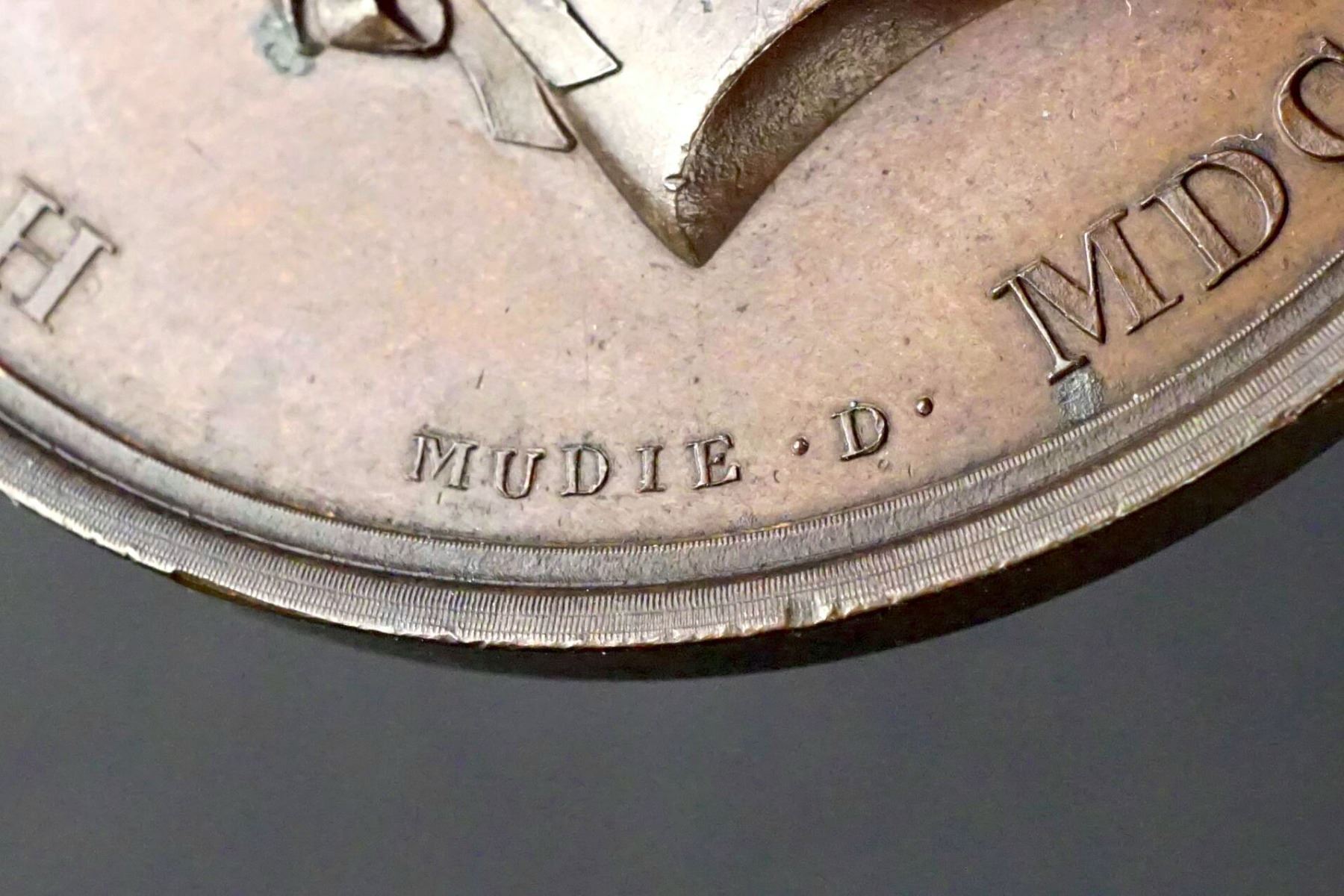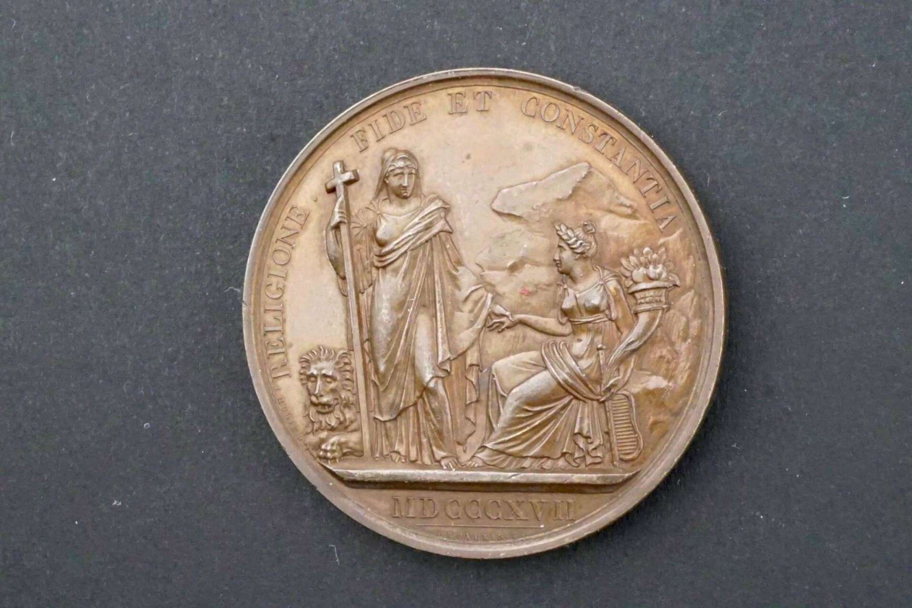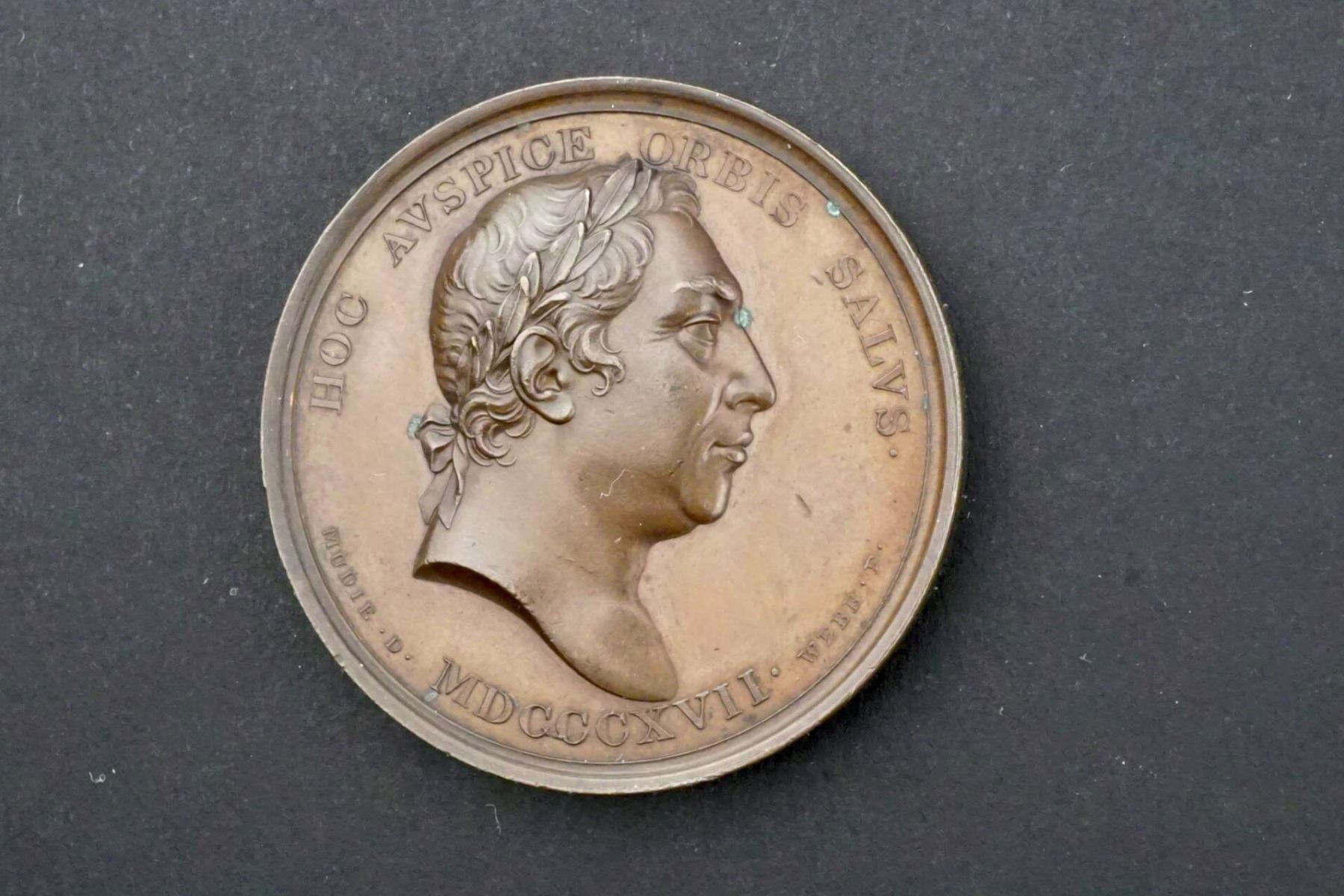 Copper, 40 mm, 38,7 grams. Head of George III right.HOC AUSPICE ORBIS SALUS. Below: MUDIE D. MDCCCCXVII WEBB. F. Reverse: RELIGIONE FIDE ET CONSTANTIA Standing woman holding tall cross, lion at feet, touching hand of seated woman with cornucopia. In exergue: MDCCCXVII DEPAULIE F. AU/UNC.