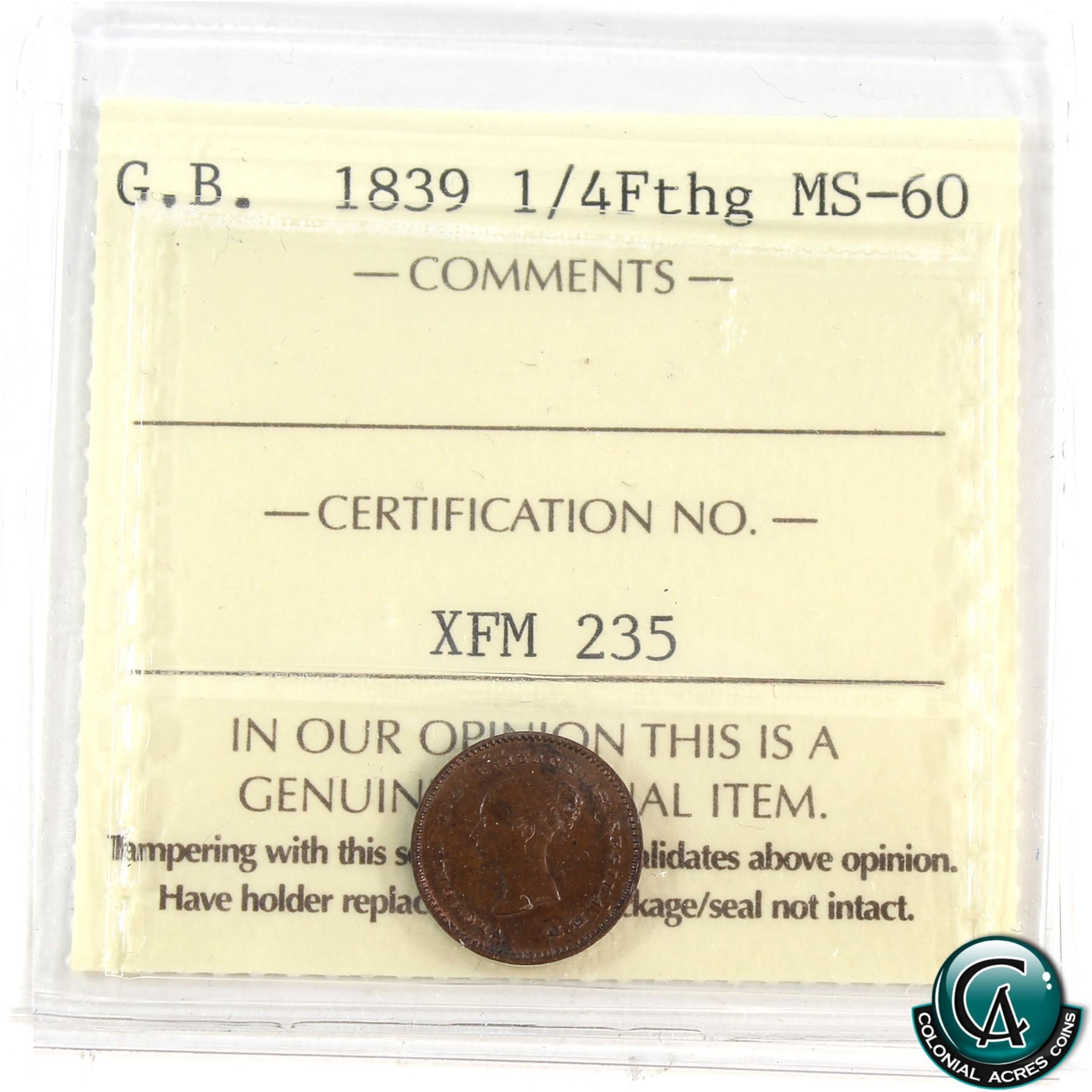 Great Britain 1839 1/4 Farthing ICCS Certified MS-60.