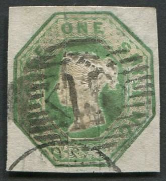 Great Britain 1847 1 Shilling Green S/C #5a embossed. This stamp is early and rare, and is VF (very fine). It has nice uniform margins all around. S/C value = $925.