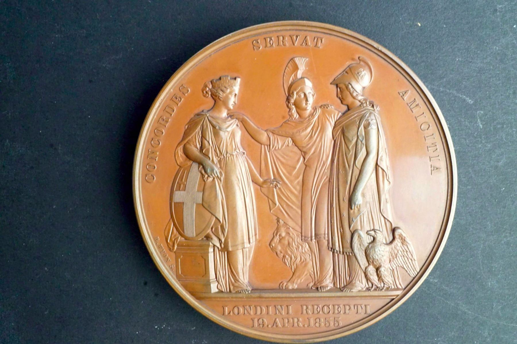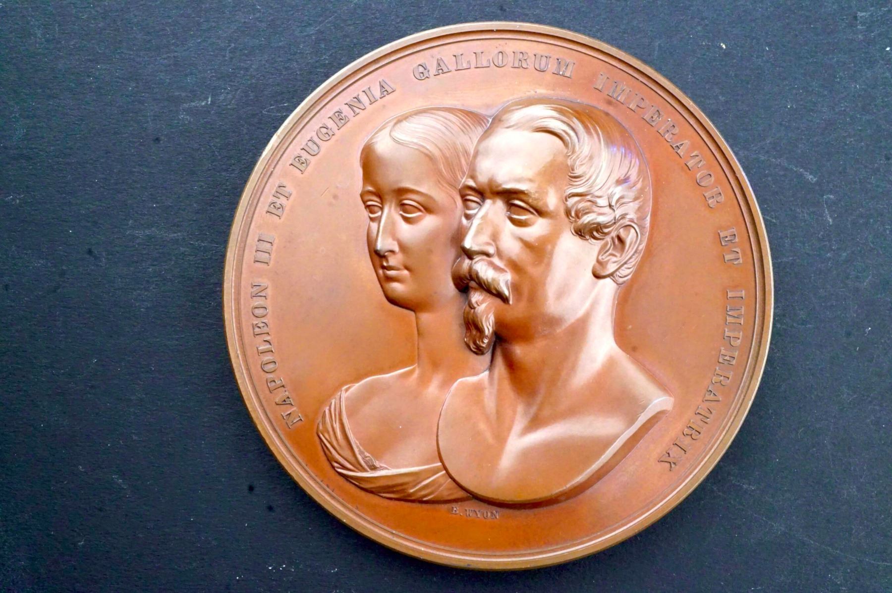 Napoleon III and Eugenia conjoined busts 3/4 turned left by B.Wyon. Rev: Britannia introducing France to London by B.Wyon Eimer #1496 BHM #2561 FDC AE-77, 241.0 grams. Edge: Plain Classic high relief w/super detail.