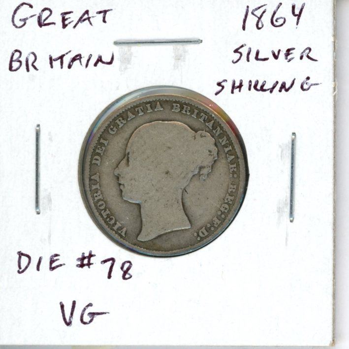 Great Britain. 1864 Silver Shilling. Die #78 on coin. VG.