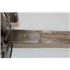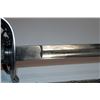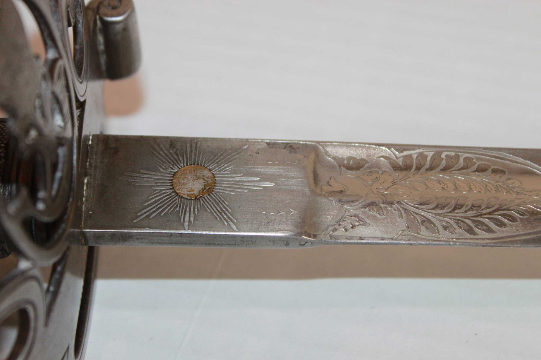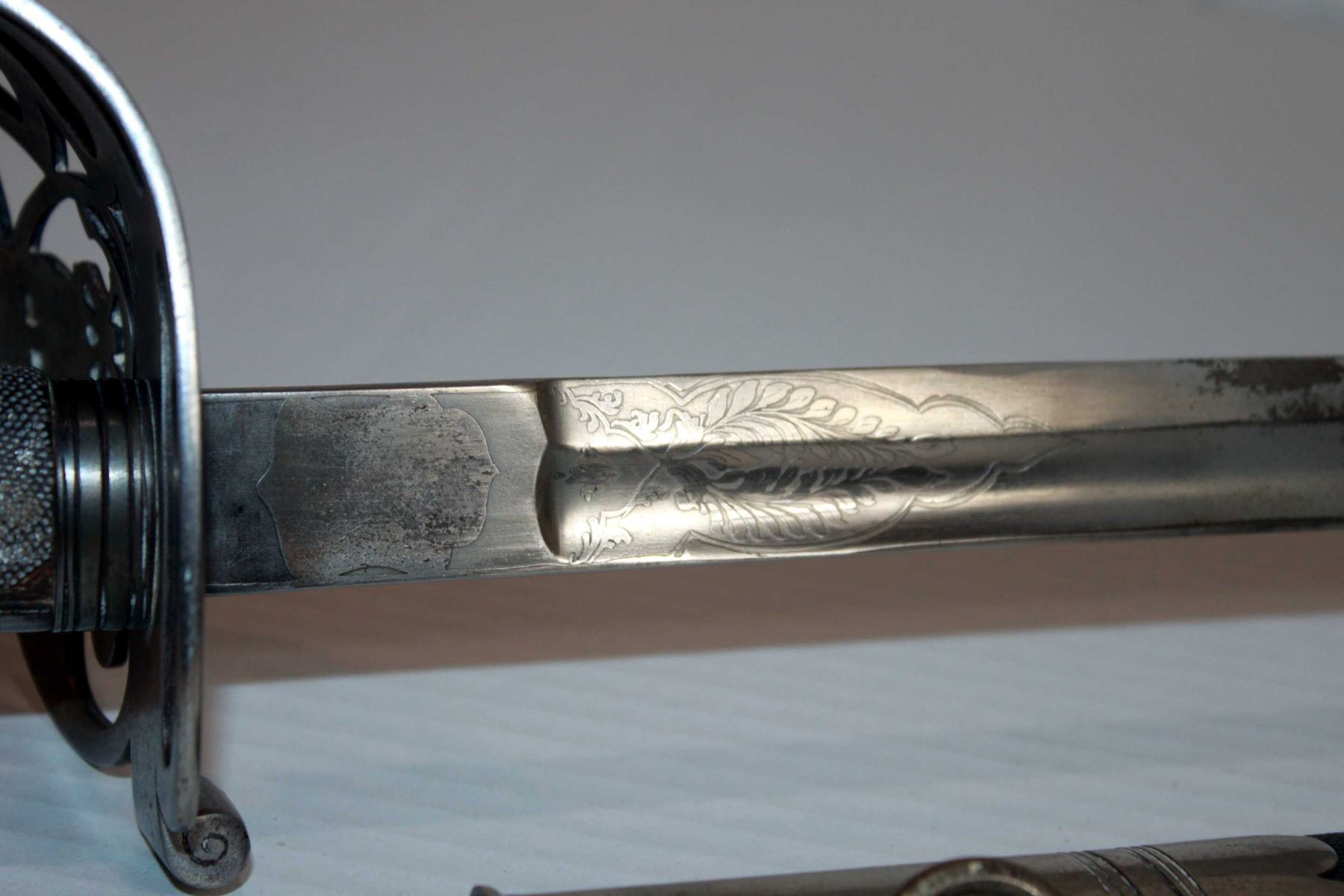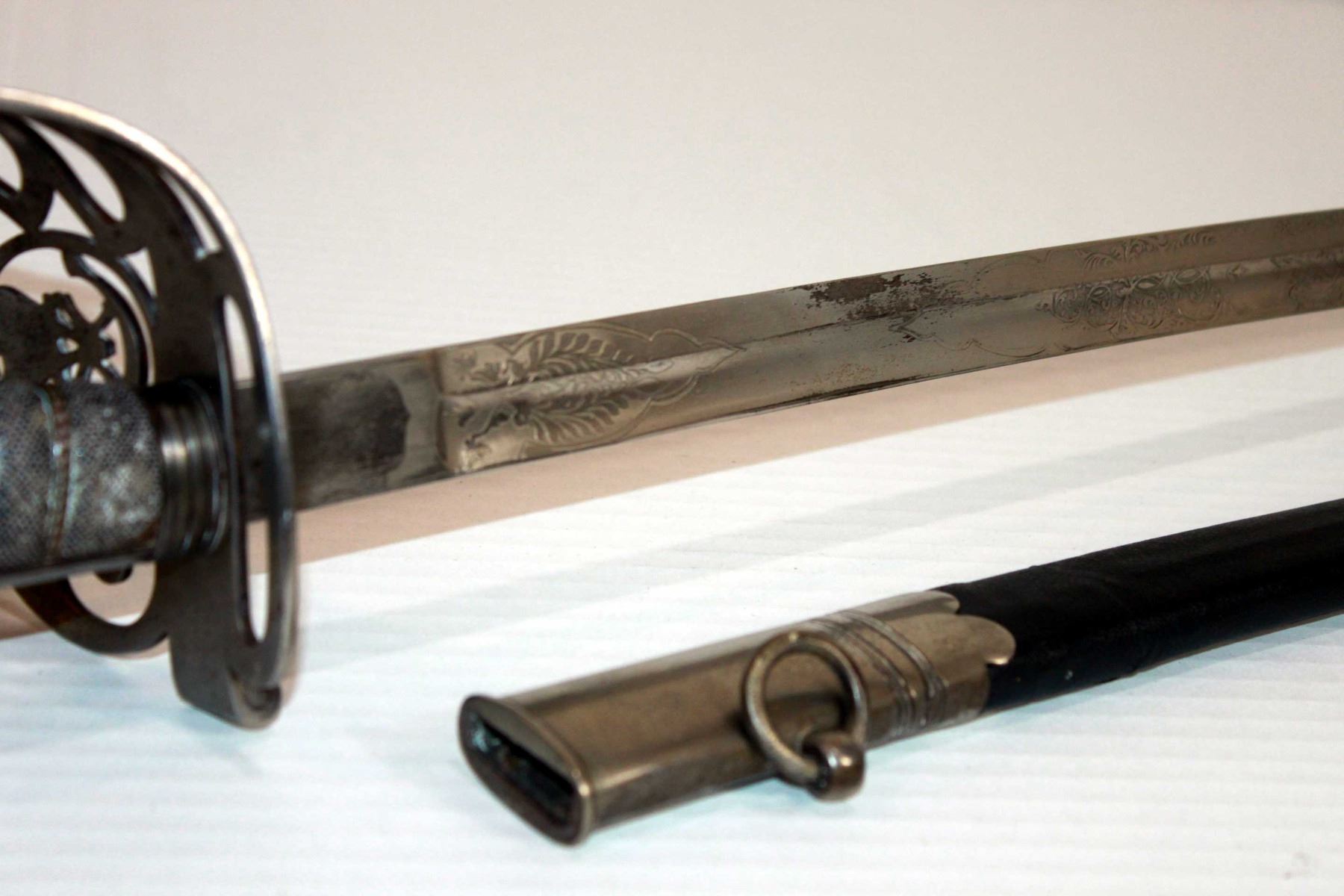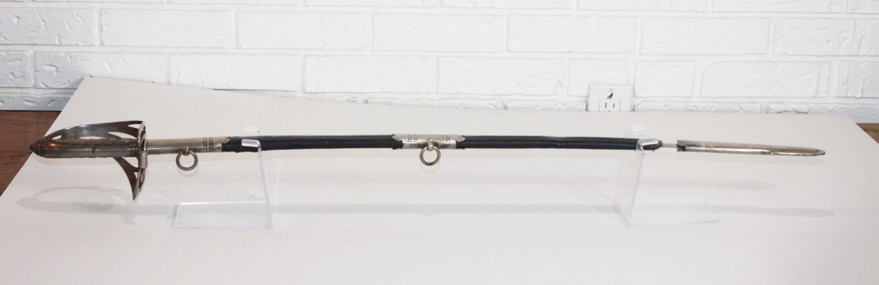 39 inch overall. 32-1/2 inch acid etched blade: Right side has a crowned horn with "rifle volenteers" amid geodesic swirls, 8 pointed star with gilt proof slug. Left side has Victorian crown amid floral and rays. The sword with slightly curved single edged blade, full width tang, silver brass hilt, wire bound sharkskin covered grip, in a leather scabbard accented by silvered tip and rings. The scabbard is in two pieces but complete.This sword will clean up wonderfully.