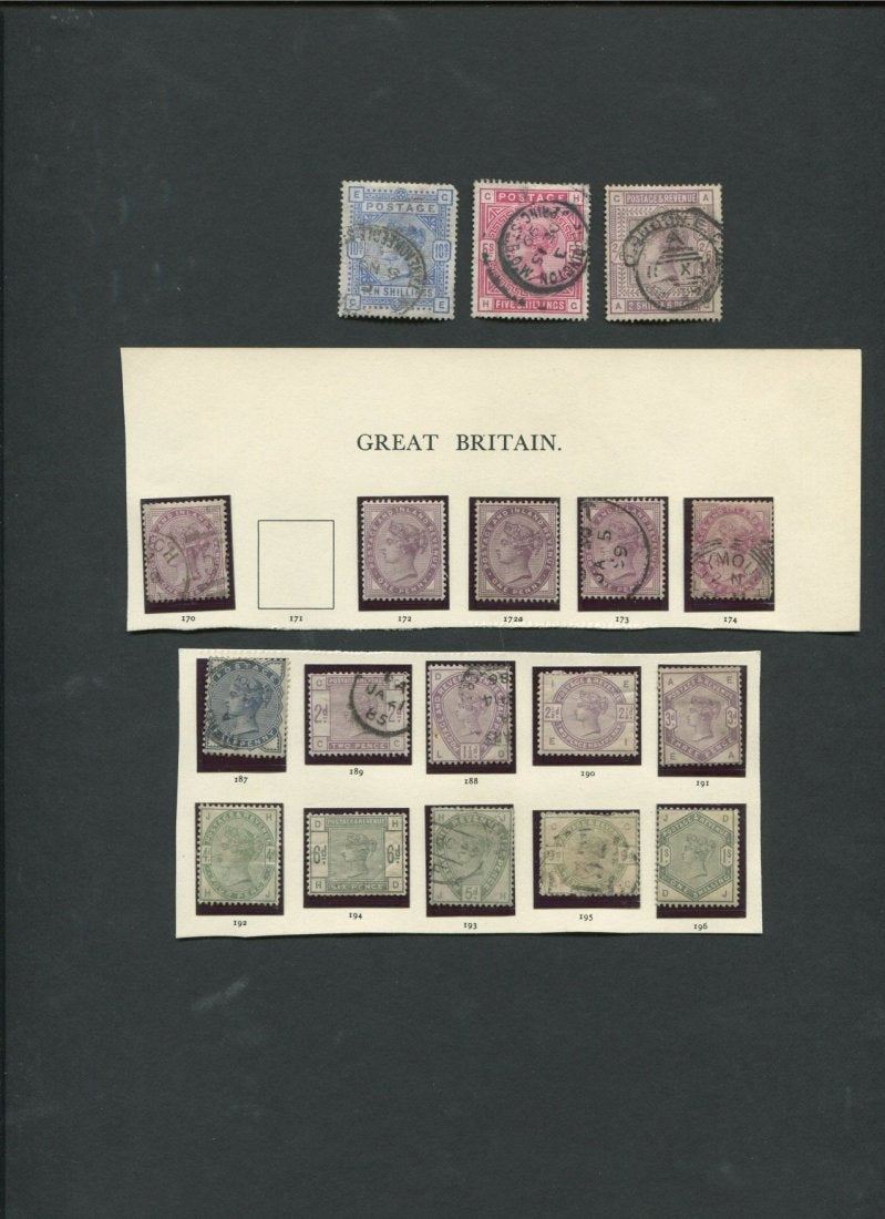 Great Britain 1881 to 1884 stamp collection. This collection contains 18 stamps. Highlights include: 1- 1/2p slate black #98 a35 (S/C value = $9), 1- 1 1/2p lilac #99 a45 (S/C value = $42.50), 1- 2p lilac #100 a46 (S/C value = $77.50), 1- 2 1/2p lilac #101 a47 mint (S/C value = $90), 1- 3p lilac #102 a48 mint (S/C value = $275), 1- 4p lilac #103 a49 mint (S/C value = $575), 1- 5p lilac #104 a45 (S/C value = $210), 1- 6p green #105 a46 mint (S/C value = $600), 1- 9p green #106 a50 (S/C value = $475), 1- 1sh green #107 a48 mint (S/C value = $1,450).