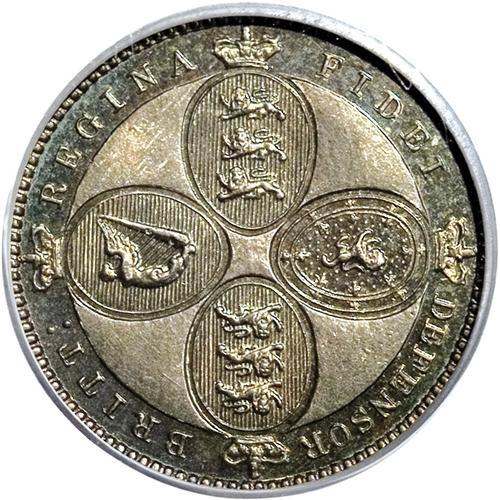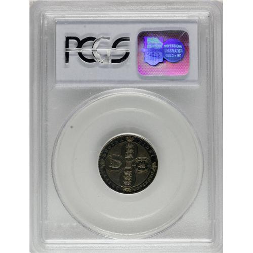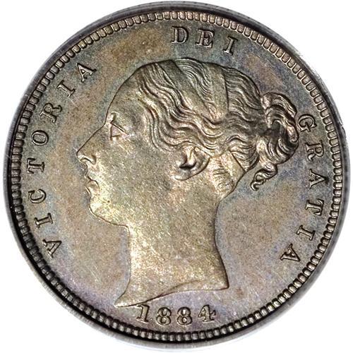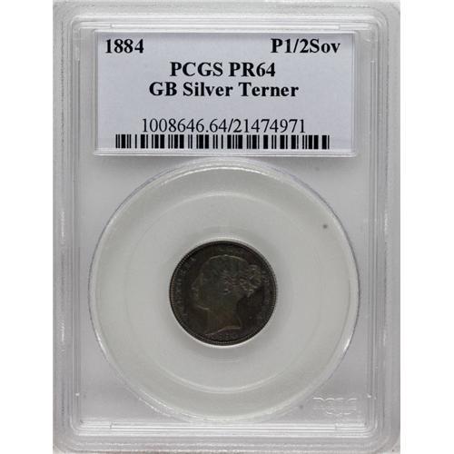 <B>Victoria Young Head pattern Half Sovereign 1884,</B></I> struck in silver, not listed in any reference but evidently R7, exceedingly rare. Reeded Edge. PR64 Terner Registry PCGS, a Choice Proof with rich gray and mauve toning. Reverse type is unique among Victorian patterns, seemingly unknown even in the Royal Mint and the Queen's collections, owing its inspiration to the Lewis Pingo pattern Third Guinea (Wilson-Rasmussen #138) of 1797-98. The reverse consists of a shield made of four ovals, each with an incuse outline, inside of which are the raised emblems of England (two opposing shields with the 3 leopards upon each), Scotland and Ireland. These differ from the Pingo shields but are identically formed within the shield design. Atop each shield, protruding to the outer circle by the rim, is a crown. The standard outer legend is as shown in our photo. Beading encircles all. The open angles surrounding and between the shields are raised and pebbled, while the broad outer circle inside the beading is recessed and prooflike (as are the backgrounds of each of the 4 shields). All in all, the design makes for a gorgeous presentation of the emblems of majesty. It's a pity this design was never adopted, for it would have been popular and a wonderful addition to the iconography of Victorian coinage. Here indeed is an incredible opportunity to acquire something truly precious of great rarity, which also enjoys an excellent provenance from the Terner Collection.<BR>Ex Goldbergs Sale 25, Lot 1309, Terner sale 2, its first American appearance at auction.<BR><BR><b>Shipping:</b> Coins & Currency (<a target="_blank" href="http://www.heritageauctions.com/common/shipping.php">view shipping information</a>)