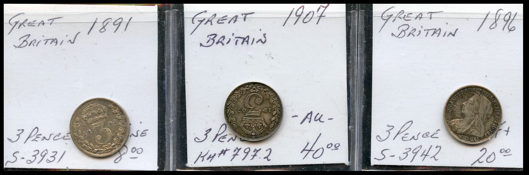 Great Britain; 1891, 1896 & 1907 3 Pence. Lot of 3 coins Fine to AU.