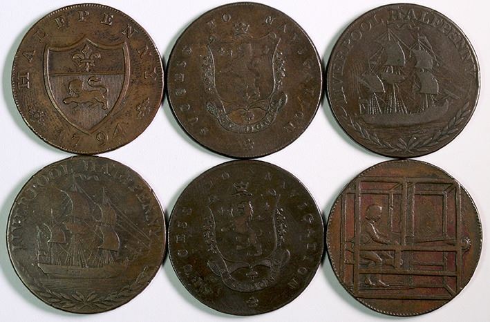 Great Britain 18th Century Trade Tokens, John Fielding Halfpenny, Manchester, 1791; John Kershaw Halfpenny, Rochdale, 1792; John Gaunt, Duke, Sleaford 1790, Lancaster 1794, Halfpennies (2, types); Thomas Clarke, Liverpool Halfpennies (2 types), aFine - aVF (6 tokens)