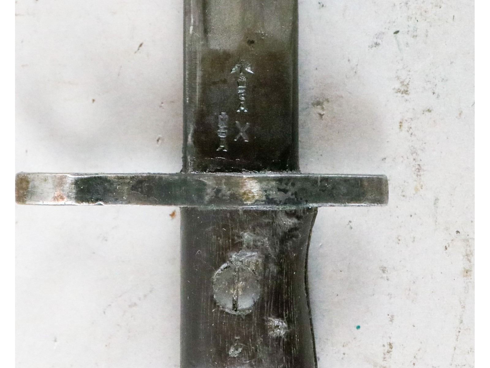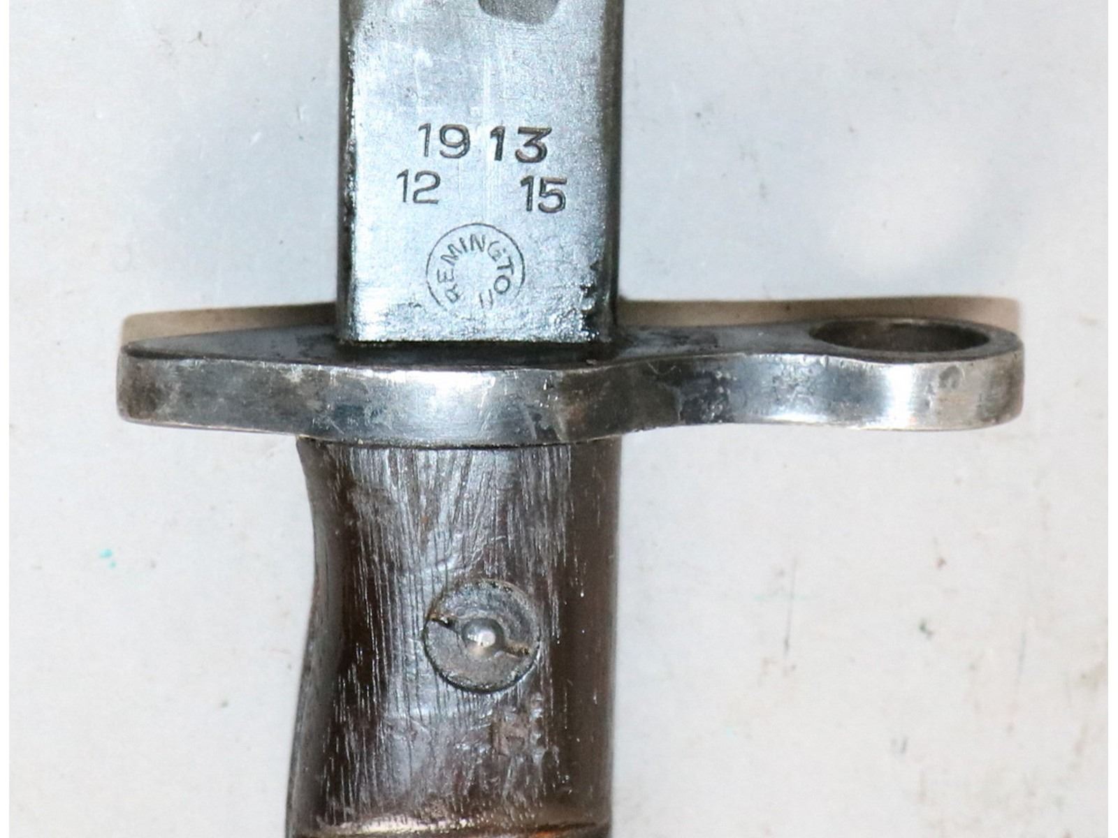 Blade measures 17", overall 22.5". Made in December 1915 by Remington. Nice blade with bold British inspection marks. Proper wood grips in used condition. Pommel and cross guard have some remaining black paint. Aged leather scabbard with partially black painted fittings. Very nice, sharpened blade. Small #7 stamped in wooden grips.