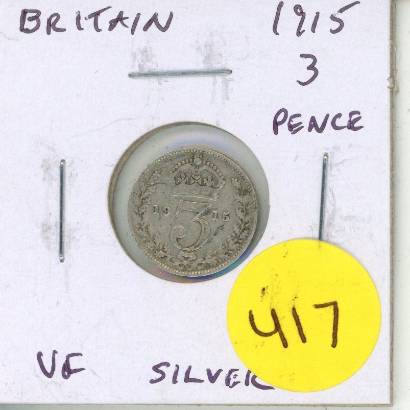 Great Britain. 1915 Silver 3 Pence. Sterling Silver. Issued during World War I. VF.