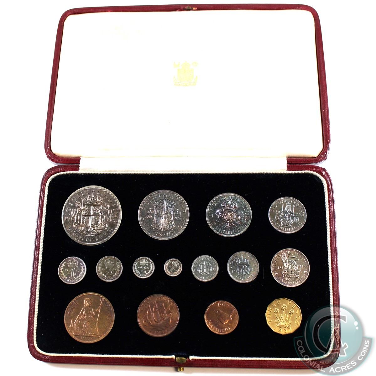 Great Britain; 1937 King George 6th Coronation 15-coin Proof Set in the original Royal Mint case. Spink PS16. Coins included are all nice proof finish with rainbow toning on the silver issues and deep rich reds on the copper. set includes; 1937 Silver Coronation Crown, Half-crown, Florin, English & Scottish Shillings, Sixpence, Three pence, Brass Three pence, Bronze Penny, Halfpenny & Farthing, as well as the silver Maundy Money Four pence to Penny.