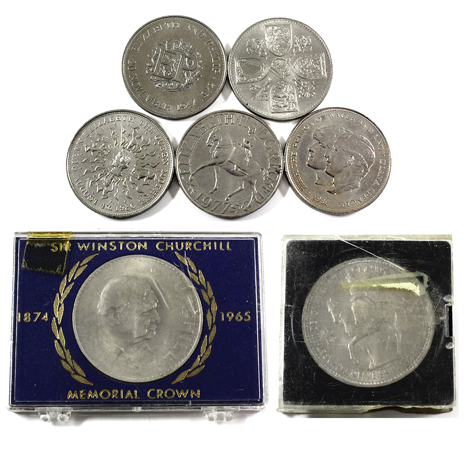 INCLUDES: 1965 Winston Churchill Memorial Crown, 1981 Charles and Diana wedding coin, 1977 Silver Jubilee Crown & more. 7pcs.