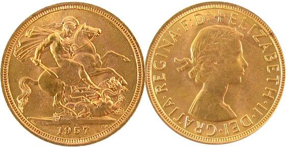 Great Britain 1957 Gold Soverign. Lustrous UNC issue. 0,2350 Gold.