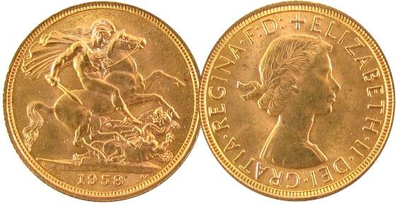 Great Britain 1958 Gold Soverign. Lustrous UNC issue. 0,2350 Gold.