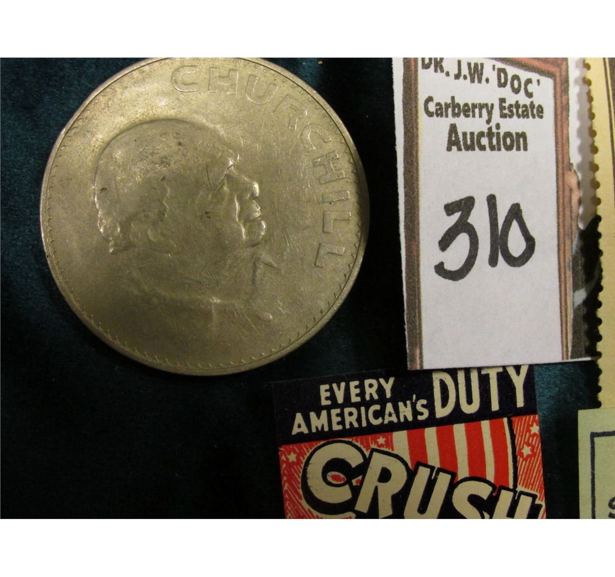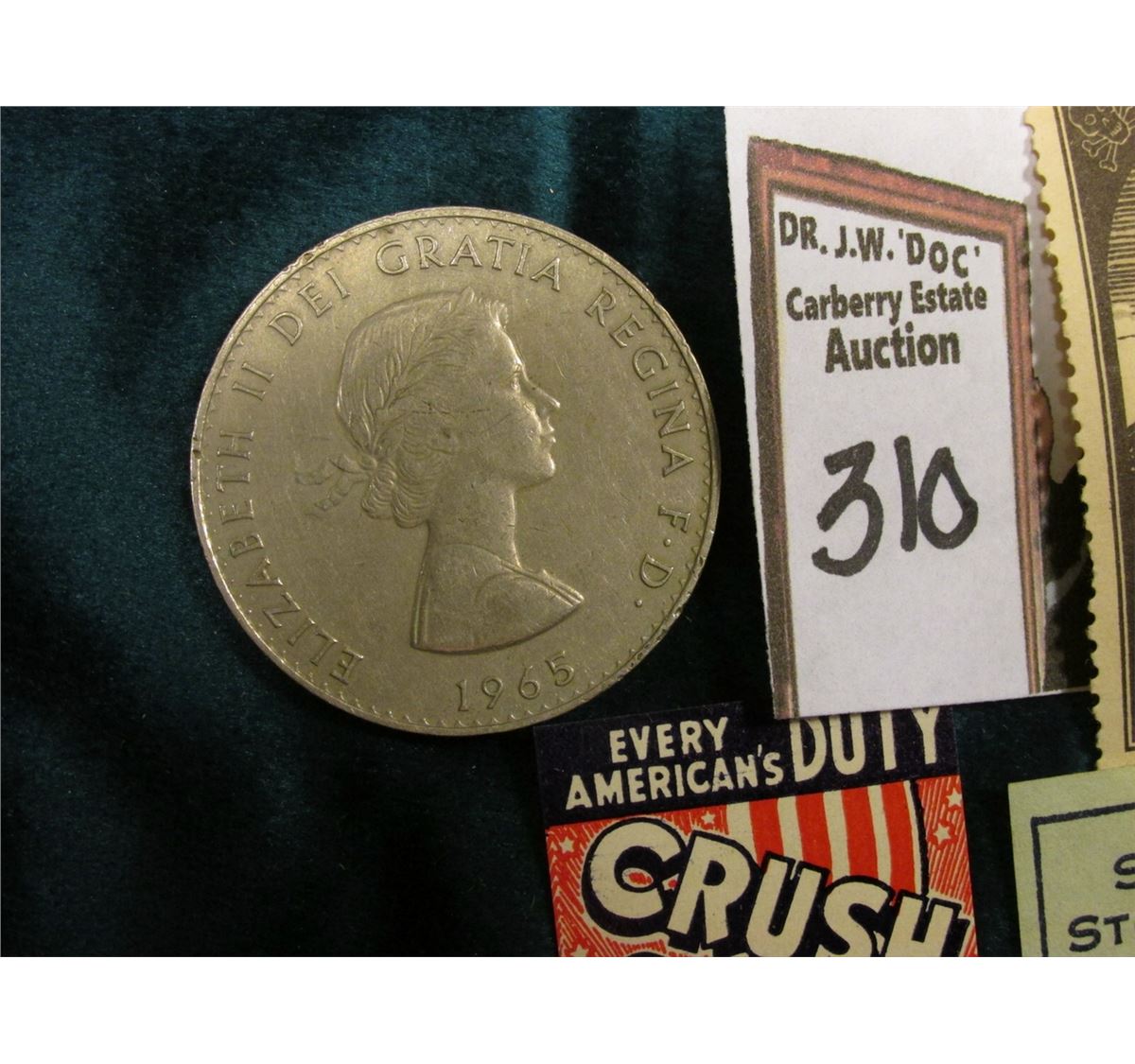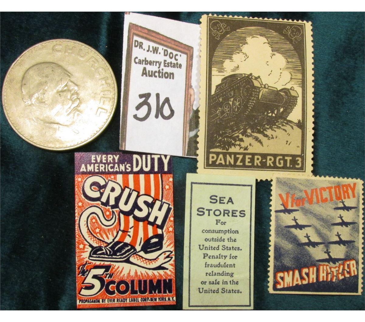 Great Britain 1965 Churchill Commemorative Crown & (4) different World War II Propaganda Stamps. 'Doc' originally was selling these at $8.00 each.