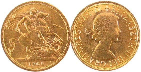 Great Britain 1965 Gold Soverign. Lustrous UNC issue. 0,2350 Gold.