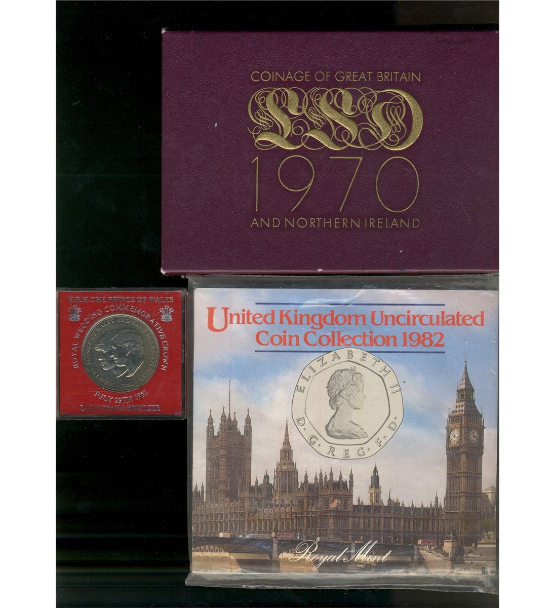 Great Britain 1982 Mint set, 1970 Proof set (2) and 1981 Crown commemorating Charles and Diana's wedding in UNC.