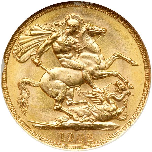 Great Britain. 2 Pounds, 1902. S.3967; Fr-399; KM-806. Weight 0.4710 ounce. Edward VII. Head right. Reverse: St. George. NGC graded MS-63.