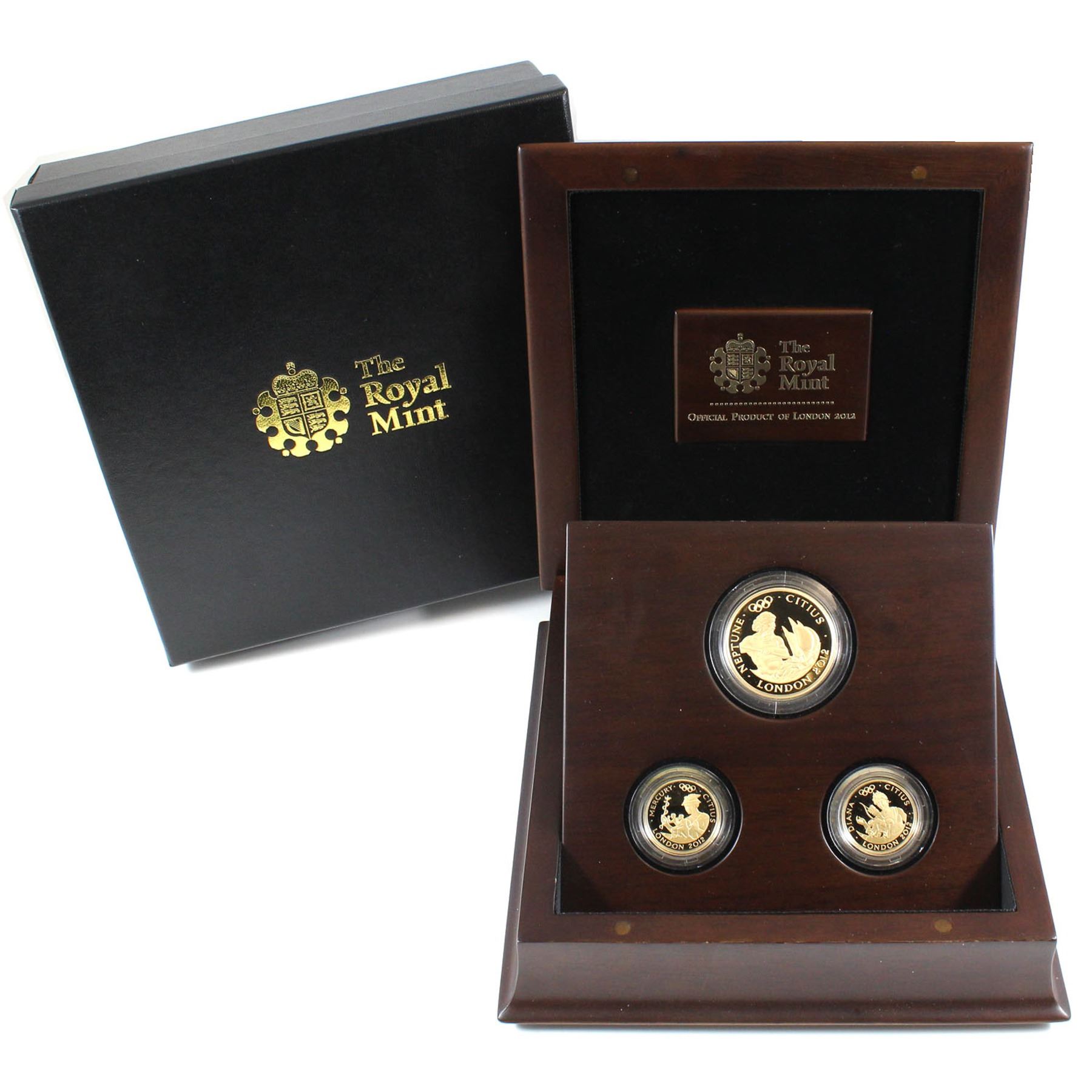 Great Britain 2012 London Olympiad Citius, Altius, Fortius 3-coin 22K Gold Commemorative Set in beautiful wooden display case. The set features Roman Gods accompanying respective Olympic sports - 'Neptune' for Sailing (1oz. Pure Gold), 'Mercury' for Running (1/4oz. pure gold) & 'Diana' for Cycling (1/4oz. pure gold). 3pcs