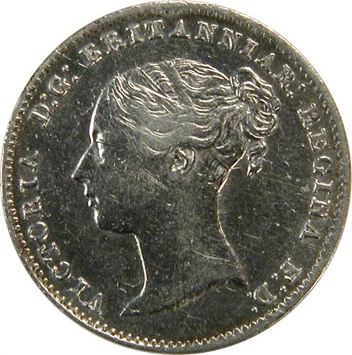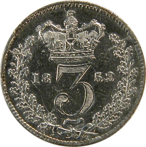 3 Pence 1859 AU. A near fully lustrous, very pale toned piece with a softly struck obverse and a fully struck reverse, both from clashed dies