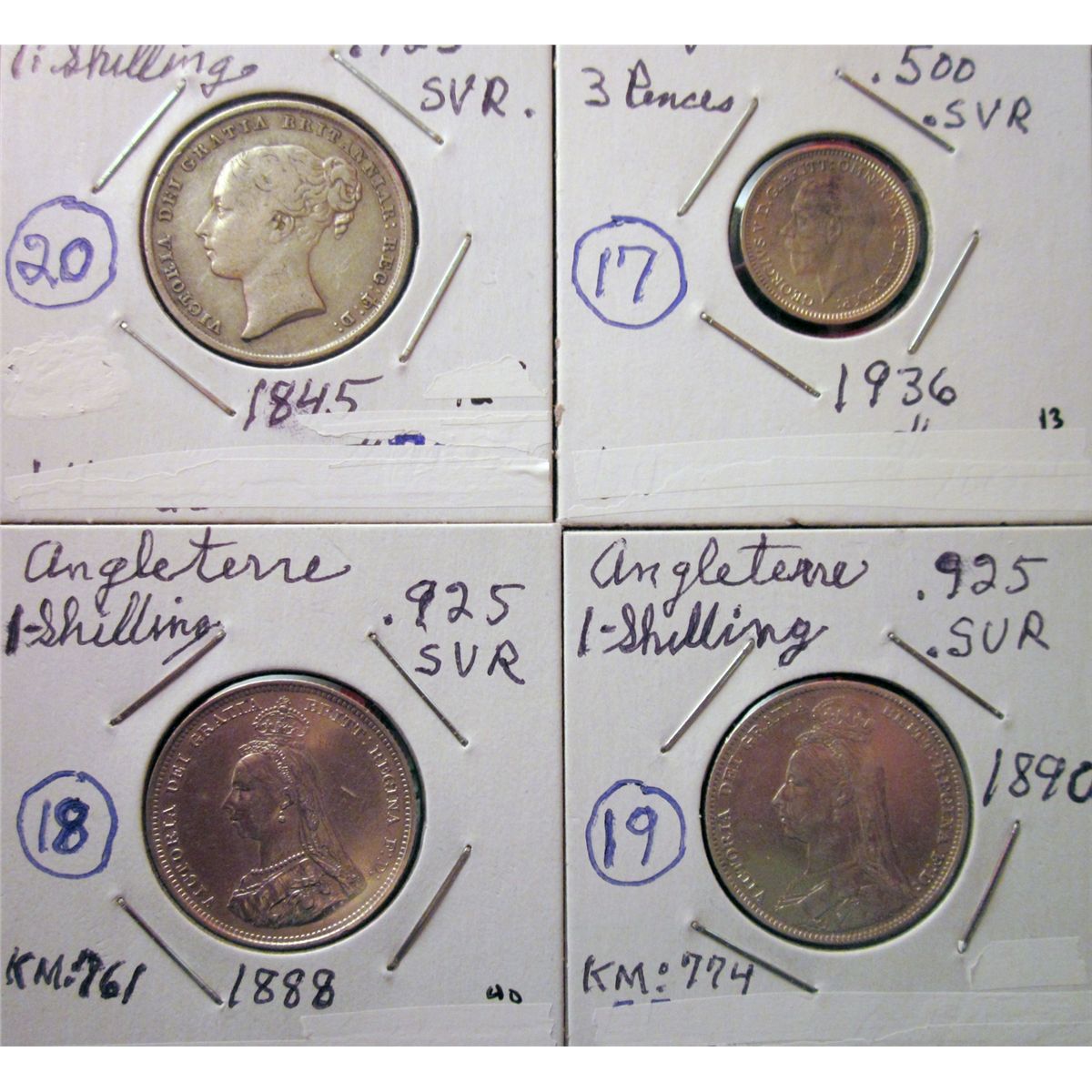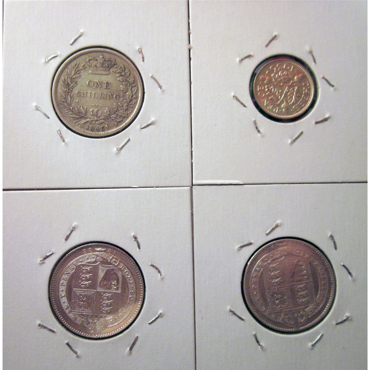 Great Britain; 3 Pence 1936 BU, 1 Shilling 1845 VF, 1888 AU-50 and 1890 EF. Lot of 4 coins.