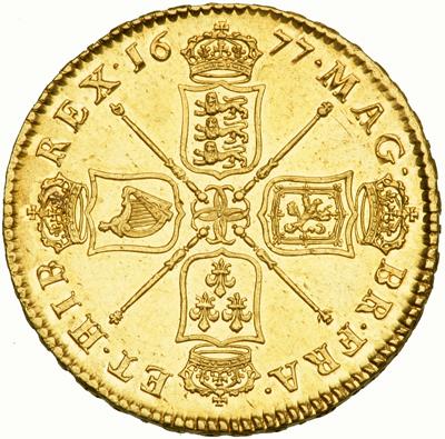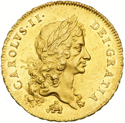 Historical note: This coin is a tribute to a man who was a great art lover, who in fact founded what is today the National Art Collection. The engraving here is true to life, the coin superbly struck, wonderfully preserved, and the hallmark perhaps the most fitting one in all of English coinage - an African elephant surmounted by an English castle, symbolically proclaiming domination over the source of the gold from which the coin was manufactured. It is fitting that this hallmark appeared on Charles II's gold coins, not only because of the happy coincidence of the source of the metal itself, but also as homage to perhaps the last of the English kings of great heart. Charles was a mere boy of twelve when he witnessed the Battle of Edgehill with his father. For a while, he stayed with his father in exile from the capital, at Oxford, Charles I's stronghold. When the Civil War's end approached, he escaped to France, in July 1646, and lived for a time at the court of Louis, safe from harm and growing into a man. He was in Holland when news reached him of his father's execution. In 1650 he landed in Scotland, where he was proclaimed King of Great Britain, France and Ireland. He formed an army of 10,000 men and marched into England the following year, where he fought Cromwell at Worcester. His Scots army was defeated soundly, and with a large bounty on his head he eluded Cromwell's soldiers again, roaming around the Continent for another eight years, trying to raise another army but without success. Cromwell died a painful death from kidney stones in 1658, and at last the Protectorate's fate seemed sealed. Charles returned to England, landing at Dover, immediately issued a proclamation guaranteeing religious toleration and a free Parliament, and was proclaimed King at Westminster on May 8 in his absence. He entered London to great proclamation from the loyalists on his 30th birthday, May 29, 1660. He was weary of strife and, to the chagrin of many royalists, offered the famous Act of Oblivion and Indemnity, forgiving many of his former opponents and enemies. He wished ardently for stability in England, and was vindictive toward few, executing only the most vicious of his father's opponents. The early years of the Restoration, however, were far from happy. The Great Plague wracked London in 1665 and it was only ended by the Great Fire of 1666, which destroyed the source of the plague, London's rats, along with virtually all of the city's medieval wooden buildings. During the 1670s, at the time this coin was minted, a new London was being built out of stone, under the guidance of such gifted builders and architects as Christopher Wren. NGC graded MS-61.