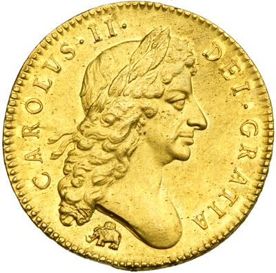 Great Britain. 5 Guineas, 1684. S-3332; Fr-283; KM-444.2. Charles II, 1660-1685. Second laureate bust of King facing right, with rounded truncation. Elephant and castle below bust. Reverse: Crowned cruciform shields, scepters in angles, interlocking C's in center, lettered edge reads +. DECVS. ET. TVTAMEN. ANNO. REGNI. TRICESIMO. SEXTO.+. Highly reflective surfaces with considerable luster and great eye appeal.
