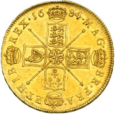 Historical note: This date was the final issue of Charles II's 5-Guineas coinage. Early in the reign, a "guinea pound" in gold was worth 20 Shillings. In 1670 the intrinsic weight was slightly reduced, reflecting the fluctuating price of gold, but by 1684 the Guinea was worth 22 Shillings. Thus the value of this 5-Guineas piece was 110 Shillings. It was a literal fortune at the time! The portrait is distinctive with its long, curved truncation. It is a statement of elegance which somehow seems to suggest a conclusion to a reign marked by transition. With the various wars of the 1670s at an end, trade increased and the king's treasury swelled, allowing for the creation of coins such as this. The king had survived civil war as a youth, waged war at sea (often disastrously) but managed to conclude foreign hostilities, dallied with a host of mistresses, produced an illegitimate son whose existence threatened yet another civil war which was happily averted, lived through years of extravagance yet never managed to produce a legal heir, and despite his intellectual deficiencies out-navigated all loyal opponents in the newly emerging two-party political climate. Charles had a substantial and well-appointed army and controlled an absolutist government but had no will to rule absolutely, and thus the former power of kingship was forever diminished in his reign, the substitute being the foundation of modern parliamentary democracy. The king's main wish as titular ruler was that his brother, James, third son of their father, should succeed him, and succeed he did in the spring of 1685. King Charles II died suddenly at the age of 54. He left his mark on England as a courteous man of good humor, cultured but not especially clever, a man of dignified stature but not very good looking, an art connoisseur and a reluctant warrior, above all a survivor of the most dire of times - a restorer of the monarchy, faithful to his subjects if not to his wife, a ladies' man and a sober judge of his fellow men, remembered by one contemporary (Halifax) as having "lived with his ministers as he did with his mistresses: he used them, but he was not in love with them." NGC graded AU-55.
