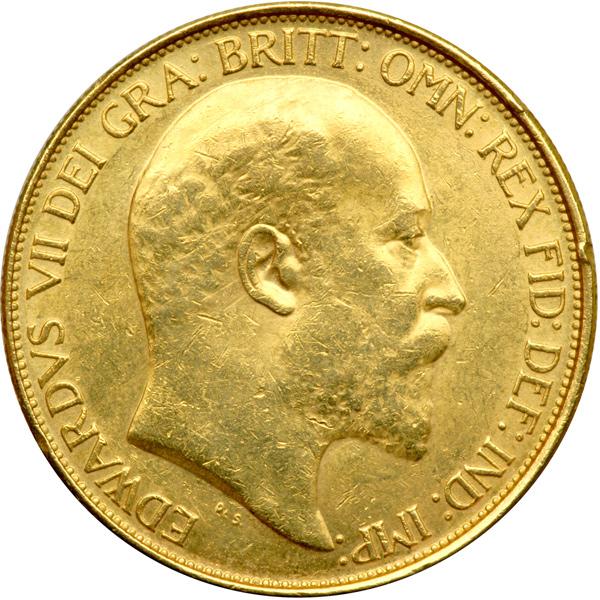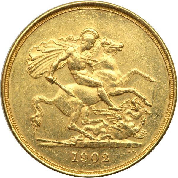 Great Britain. 5 Pounds, 1902. S.3965; Fr-398; KM-807. Weight 1.1775 ounces. Edward VII. Head right. Reverse: St. George. Lightly polished with a few edge nicks. Very Fine.