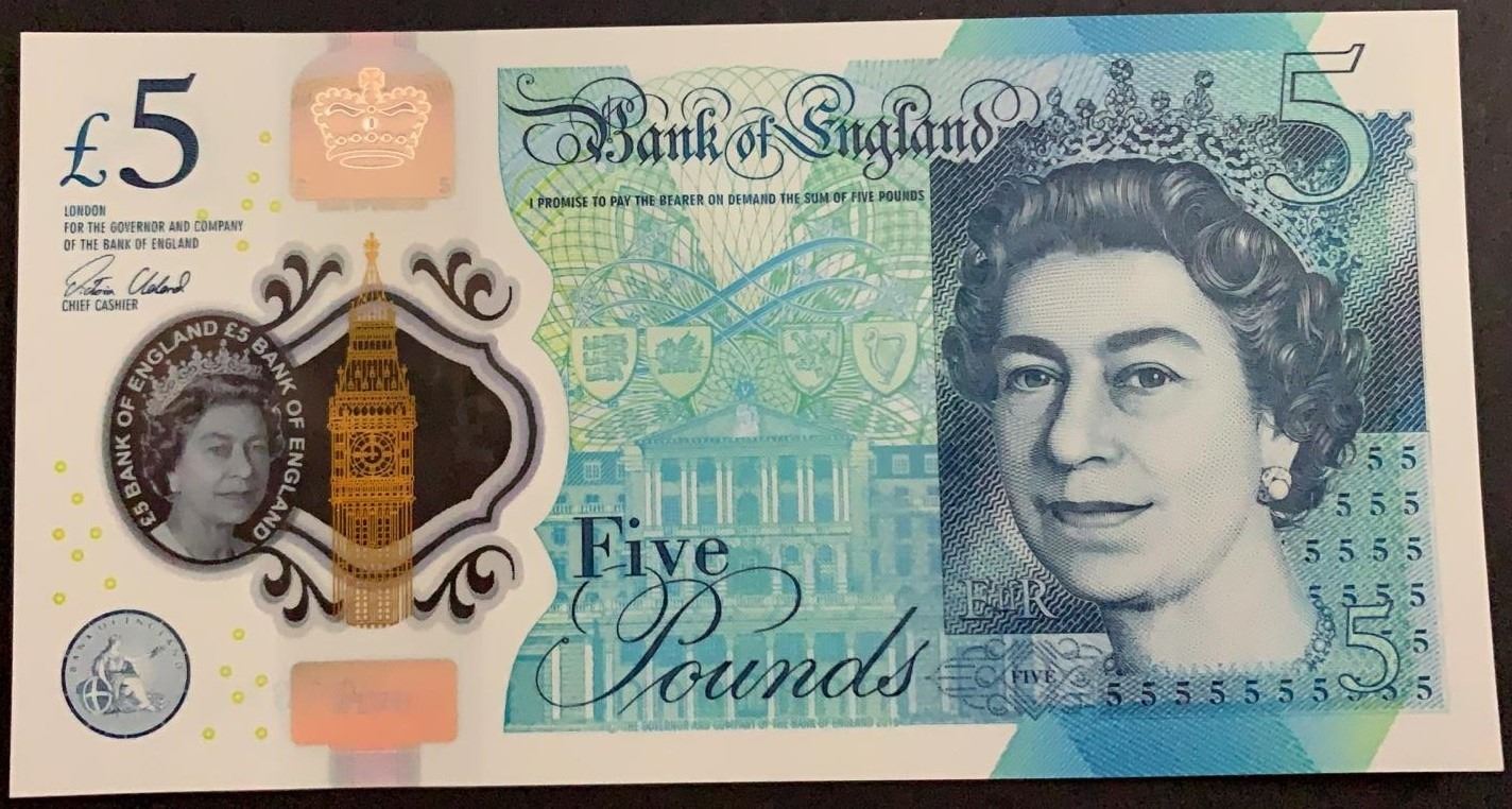 Great Britain, 5 Pounds, 2016, UNC, p394br/Queen Elizabeth II portrait, serial number: AK40 360850, polymer