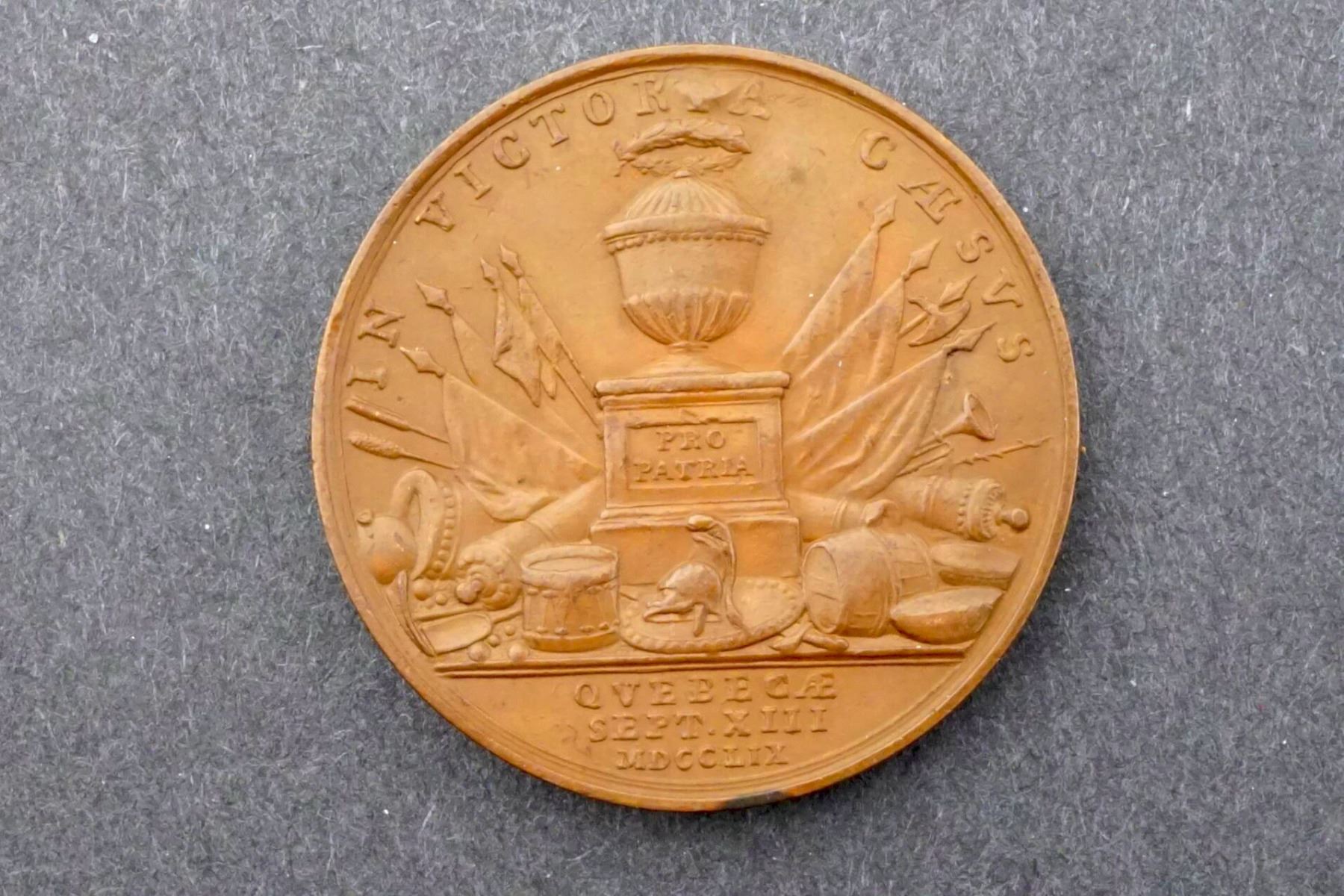 37 mm, 21.4 grams. Obverse: Bust of Wolfe, left.IACOBUS WOLFE ANGLUS. Reverse: IN VICTORIS CAESUS (In victory, he fell). Urn at center, wreath above, on stand marked: PRO PATRIA all surrounded by militaria and flags. In exergue: Québec AE / SEPT. XIII / MDCCCLIX. Condition is a lovely AU.