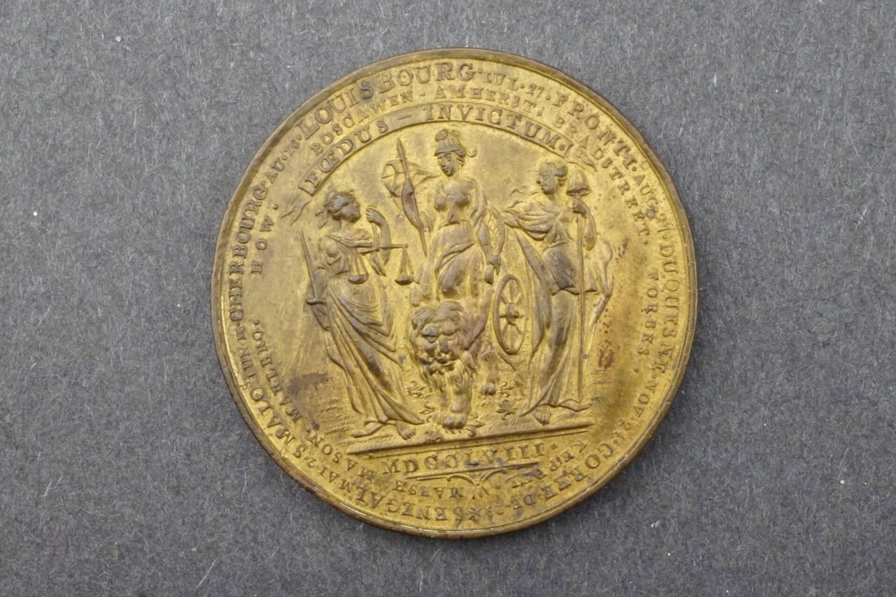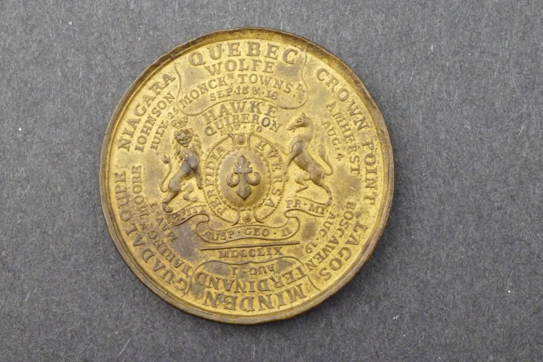 Both sides of this piece appear as reverses, with portrait obverses of King George II, ant both portrait pieces are offered as separate lots in this auction. 43mm, 31.1 grams. One side: Britannia seated in cart drawn by lion. At left, standing Justice. At right, another standing female representation. Below all: MDCCCLVIII. Above, on a banner: ECEDUS INVICTUM. Around, in two concentric circles, the exterior listing victories, with Louisbourg on top and most prominent. The inner circle names the Admirals and Generals, with Boscawen and Amherst most prominent on top. The other side: At the centre, a shield held by a crowned lion and a unicorn. On the shield, a French Fleur-de-Lys upside down. All around, details of victorious battles and generals. At top, Québec / Wolfe.