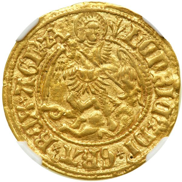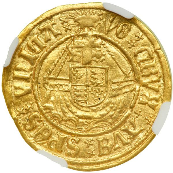 Great Britain. Angel, ND. S.2192; Fr-151. Henry VII, 1485-1509. Mint mark, pheon. Obverse: St. Michael slaying dragon. Reverse: Ship bearing shield and cross. H and rose at sides. Struck on a full (larger than normal) flan, sharply defined overall, and well centered, this is an outstanding example of a scarce hammered gold coin. NGC graded AU-55.