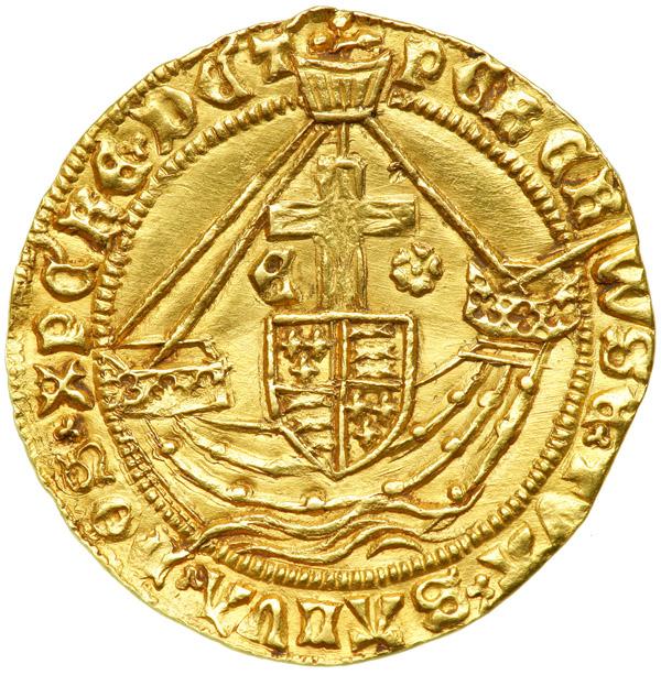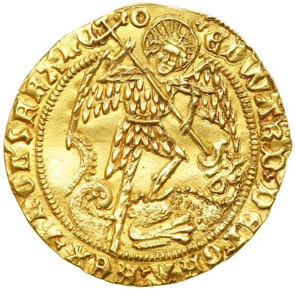 Great Britain. Angel, ND. S.2091; Fr-139. Edward IV, Second Reign, 1471-1483. London. Obverse: St Michael slaying dragon. Reverse: Shield on ship, E and rose by mast. A superb example and thus very rare. PCGS graded MS-61.