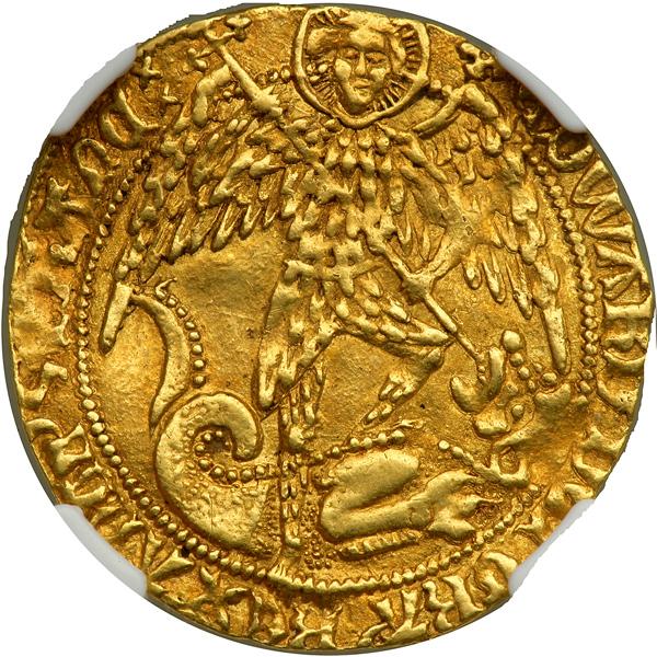 Great Britain. Angel, ND. S.2091; Fr-139. London mint. Mintmark, Pierced cross. Edward IV, Second Reign, 1471-1483. St. Michael slaying dragon. Reverse: Cross and arms on ship. NGC graded EF-45.