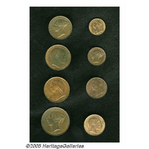 <B>Assorted bronze lot including:</B></I> Farthing 1838, XF; Farthing 1895, mostly Red UNC; High Horizon Halfpenny 1902, mostly Red UNC; Halfpenny 1901 iridescent Brown UNC; Halfpenny 1855, about XF; Plain Trident Penny 1854, glossy AU; Penny 1901 Choice AU; and a High Horizon Penny 1902, UNC with some mint red color remaining.