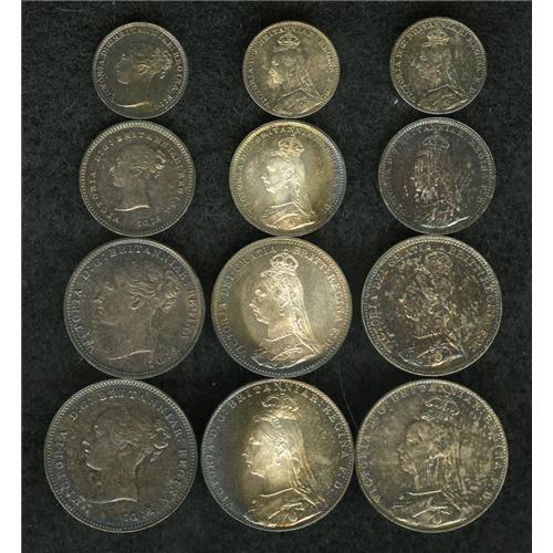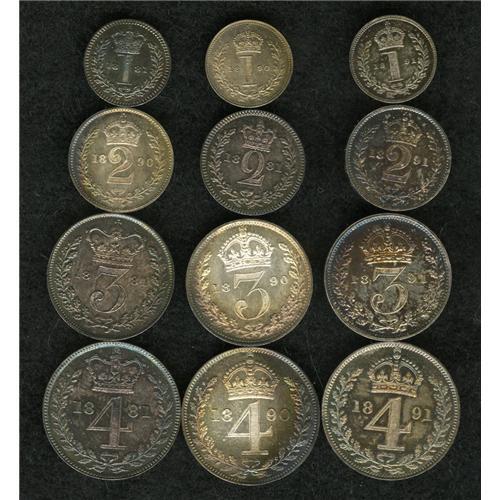 <B>Beautiful Maundy Set trio:</B></I> Victoria Young Head 1881, S-3916, Choice Unc. with lovely mauve and gold toning; Victoria Jubilee Head 1890, S-3932, Choice to Gem Unc. with gorgeous iridescent and frosty white surfaces, "spotlight" effect on several; and Victoria Jubilee Head 1891, also S-3932, a gorgeous Choice Unc. set with iridescent toning of bright gold and blue, in a dated long plush Maundy Coin case. Wonderful coins, worth more than Spink catalogue value, which totals $365, which is about $725 as this catalogue is being written.<BR><BR><b>Shipping:</b> Coins & Currency (<a target="_blank" href="http://www.heritageauctions.com/common/shipping.php">view shipping information</a>)