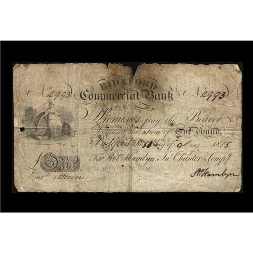 <B>Great Britain</B></I> Bideford Commercial Bank <$1 May 30, 1815<BR>This <B>Good</B></I> note shows edge damage and internal apertures.