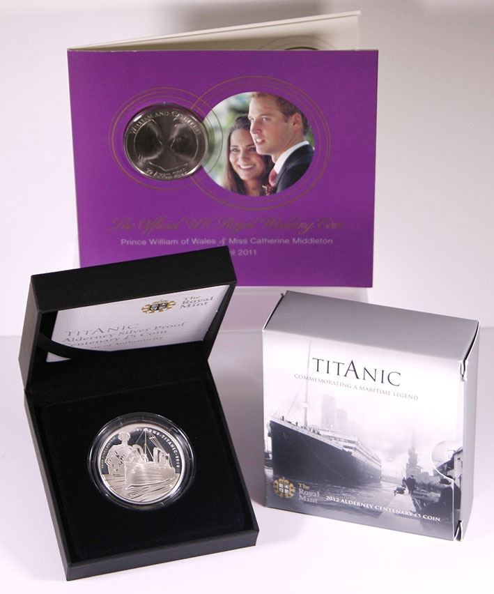 Proof sets, 1981, 1982 (2); uncirculated Fifty Cents, 2016 Beatrix Potter and Five Pound, 2010 Restoration, 2011 Wedding, 2012 London Games, 2013 Jubilee PNC; together with Jersey uncirculated set, 1984; plus Alderney proof sterling silver Five Pounds, 2012 (lot)Titanic