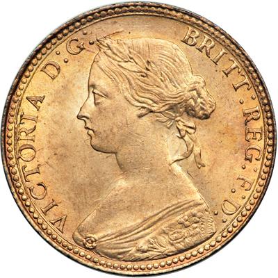 Great Britain. Bronze Halfpenny, 1860. S.3956; KM-748.2. Victoria, 1837-1901. Beaded borders both sides. Obverse: Young bust of Queen by L C Wyon left. Reverse: Britannia seated right. This coin, the first halfpenny in the bronze series, is remarkable because it has retained practically all its original mint red and luster. After 149 years! NGC graded MS-64 Red.