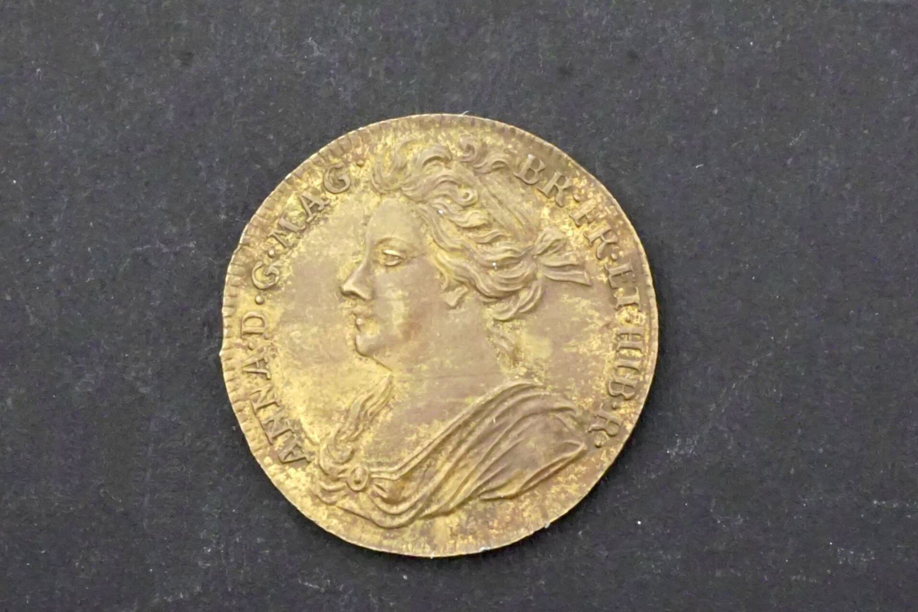 25 mm, 4,4 grams. Obverse: ANNA. DG. MAG. BRIT. FR. ET. HIB. Bust of Queen to left. Reverse: ANGLOR. ET. BATAV. VIRTVTE. Several ships on the sea, map around. In exergue: INCENS CLASSE OPES / ERIC. INTER / CEPT 1702. This "expedition" was actually a seizure of Spanish ships carrying bullion from the Americas. Some British silver coins were struck with the notation VIGO below the Queen's bust, indicating they were struck from this seized silver.This example is in Choice UNC condition, but for some edge imperfections that may be adjustments. There is also some yellow colour, especially on the reverse, that may indicate a light gilding.