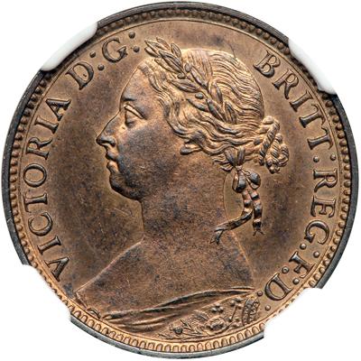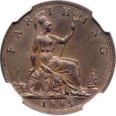 Great Britain. Bronze Proof Farthing, 1885. S.3958; KM-753; Peck-1840 (Extremely Rare); Freeman-556 (dies 7+F) Rarity-19 (2 to 5 specimens in existence). Victoria, 1837-1901. Obverse: Young portrait of Queen left, with hair in bun. Reverse: Britannia with shield and trident. This piece has mirror fields with a mirror edge and is far superior to the currency coin in its crispness of detail. Rarely seen and missing from the Colin Cooke collection of farthings, Peck lists only the Rev. E. Rogers specimen, which may be this coin. Much rarer than the proof farthings of the 1860's and 1870's. In a new NGC 4 prong holder. NGC graded Proof 65 Red & Brown.