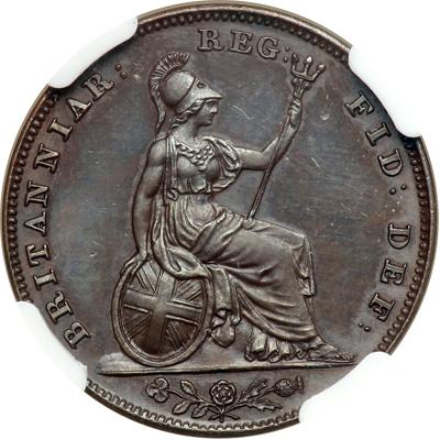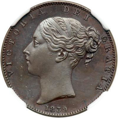Great Britain. Bronzed Proof Farthing, 1839. S.3950; KM-725. Victoria, 1837-1901. Reverse upright. Obverse: Wyon's young portrait of Queen left. Reverse: Britannia with shield and trident. Superb dark chocolate bronzing over copper surfaces. Probably from the Proof set of the same year this piece has been exceptionally well preserved. In a new NGC 4 prong holder. NGC graded Proof 64 Brown.